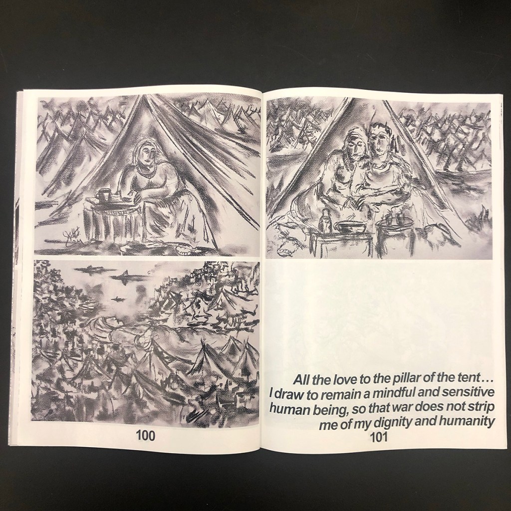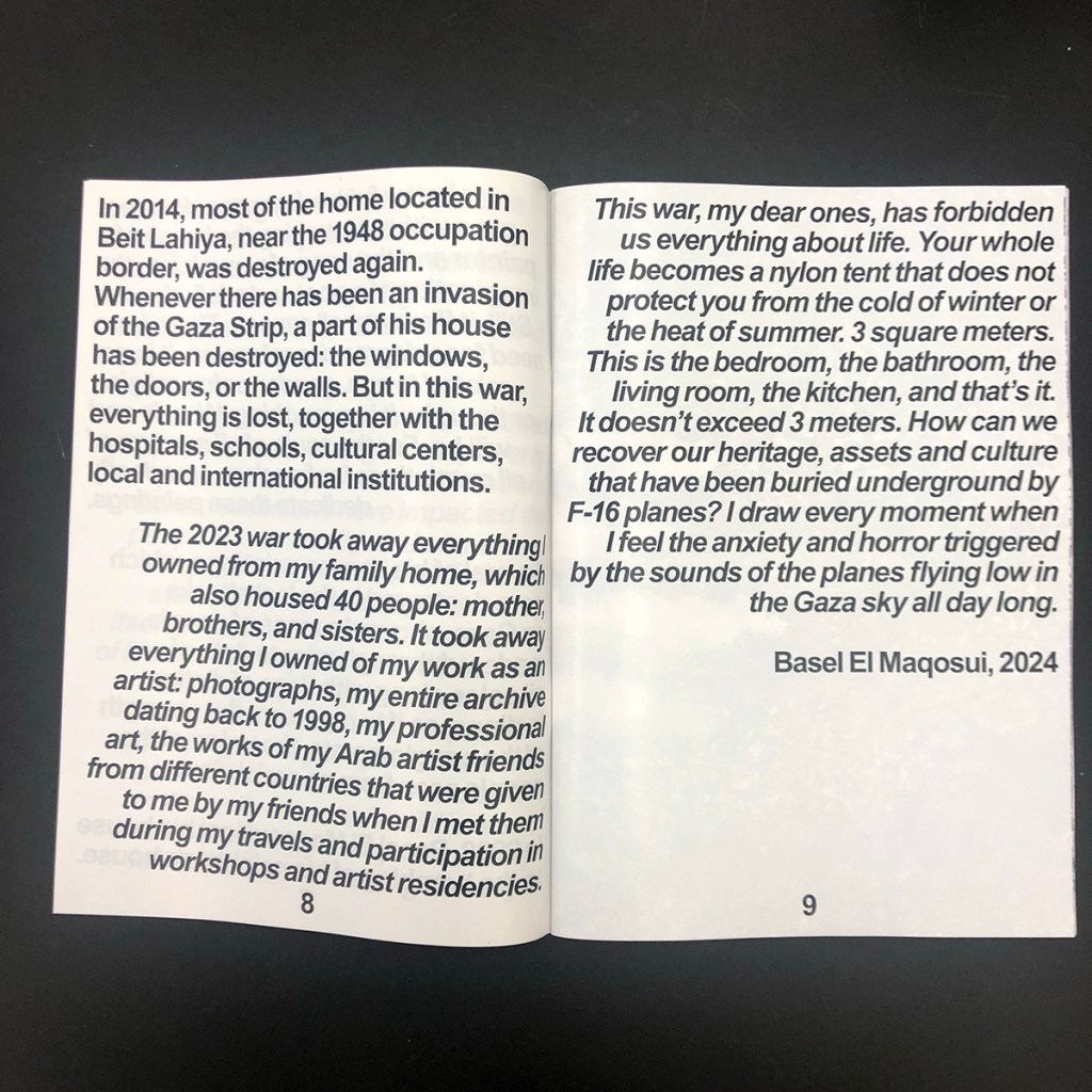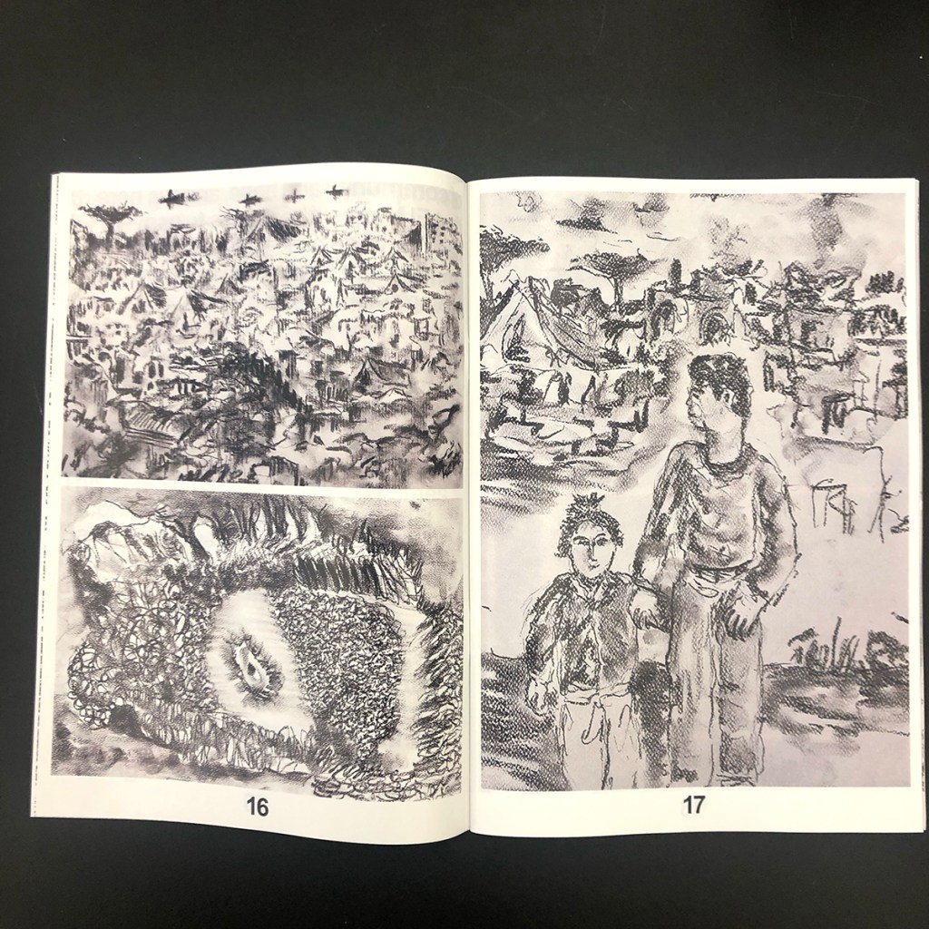 The drawings in this collection were all created during the genocidal war on Gaza (oct. 2023 – ongoing) and depict a deliberately confused, black- and-white scenario in which the artist traces, through clear and faded lines, images of refugee camps, tents, conglomerates of displaced people, and lacerated streets, all fused into a dense and highly compelling composition whose abstraction reproduces the looming and constant sense of bewilderment and confusion.