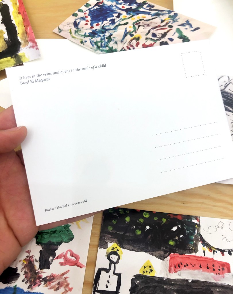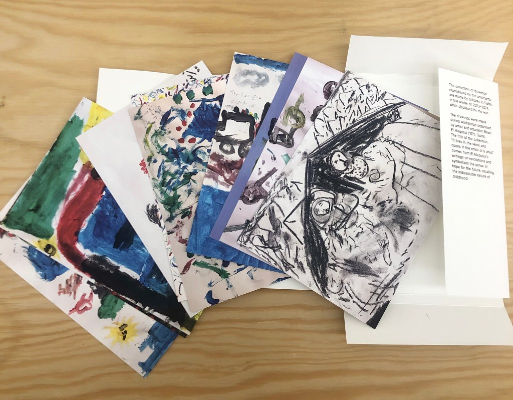 The collection of drawings reproduced on the postcards are made by children in Rafah in the winter of 2023-2024, while displaced by the war.