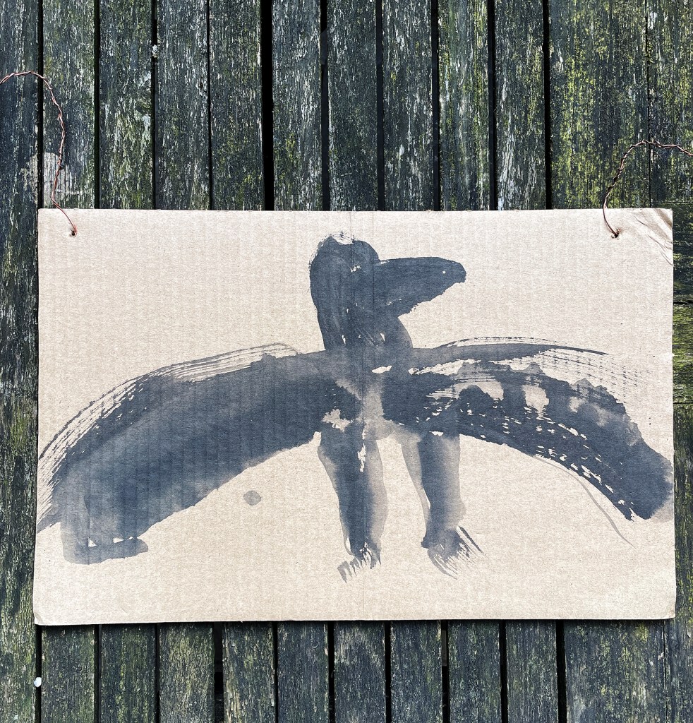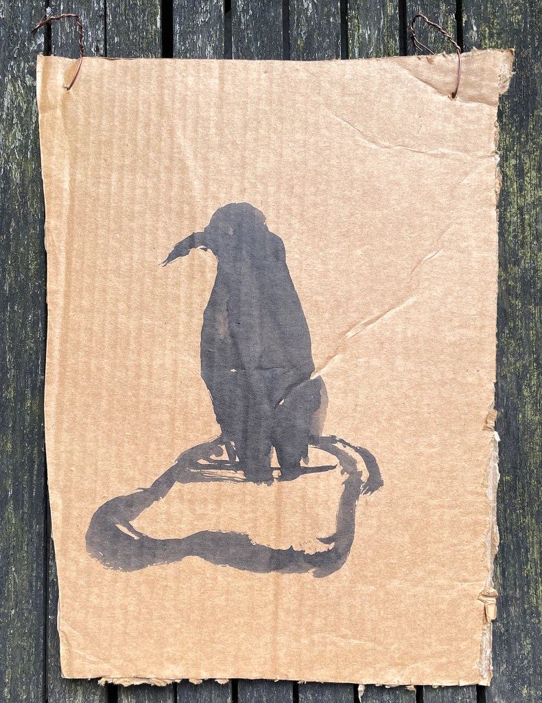 The crows that co-inhabit the environment of the Los Angeles garden have become the living muses of this series of paintings on recycled cardboard, a medium that brings the international trade of goods and their journeys to the forefront.