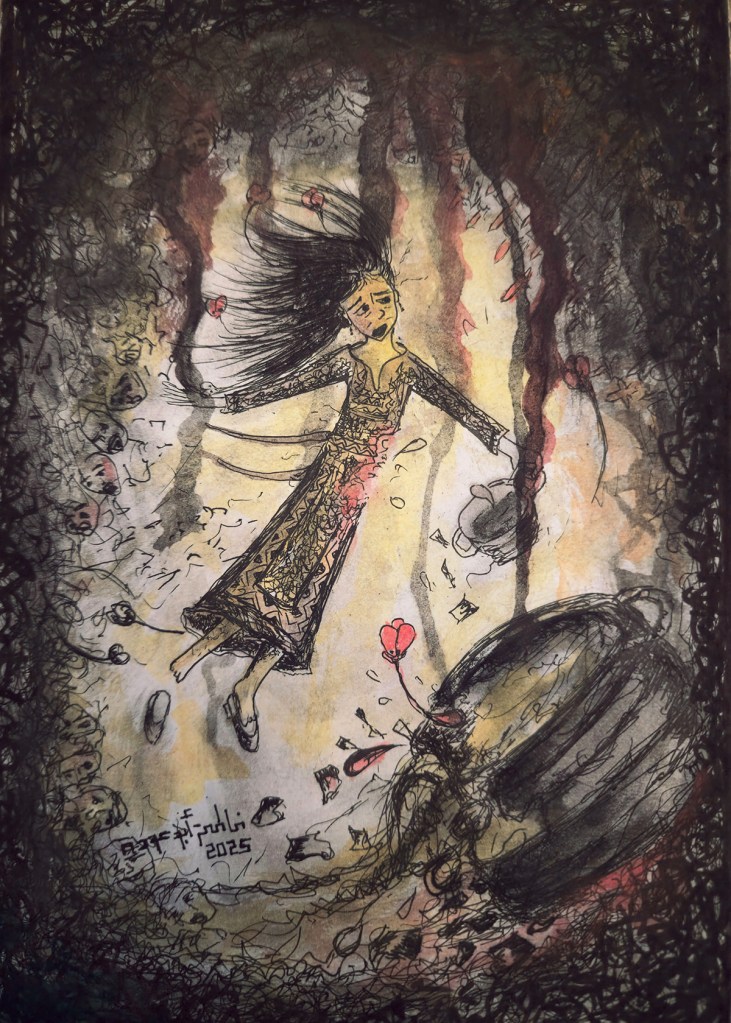 Materials used for the original artwork: Natural charcoal, black ink pen, natural materials such as hibiscus, turmeric, and red pepper juice.