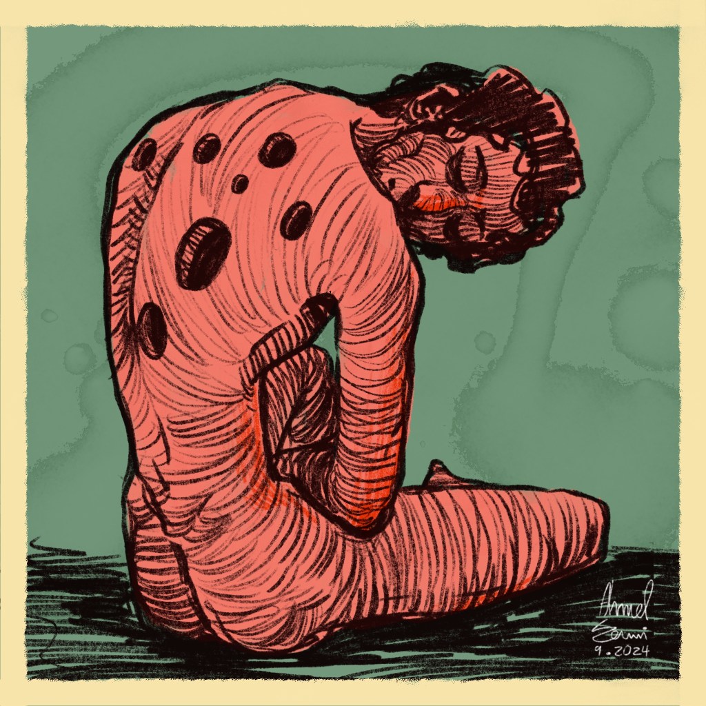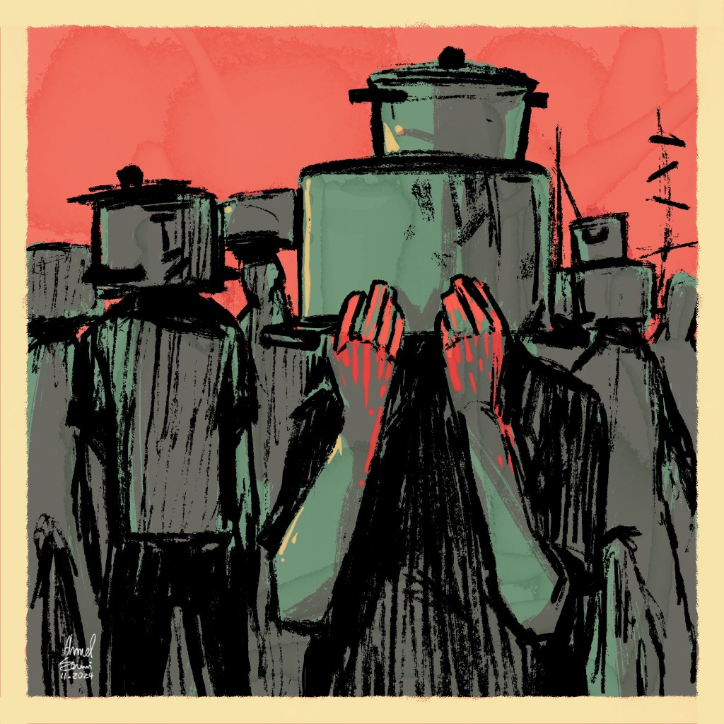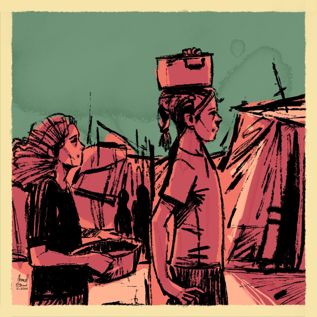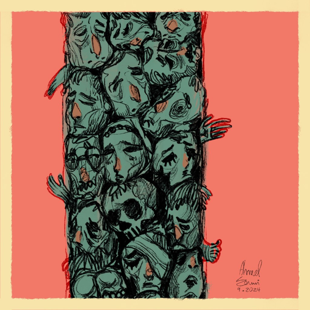 Ahmad Al-Adawi (b. 1993, Gaza; displaced in Gaza) started as an illustrator, and his artworks use a clear and impactful artistic language to show raw images of fear and pain, but also tenderness, strength, and the tenacity to survive.
