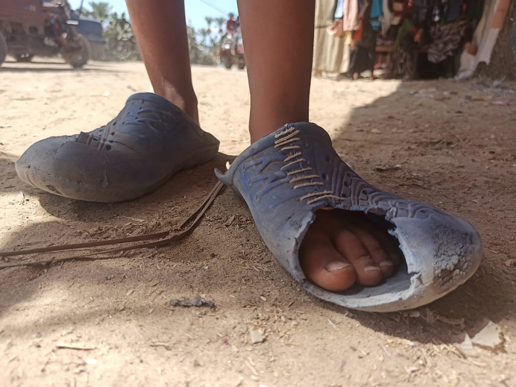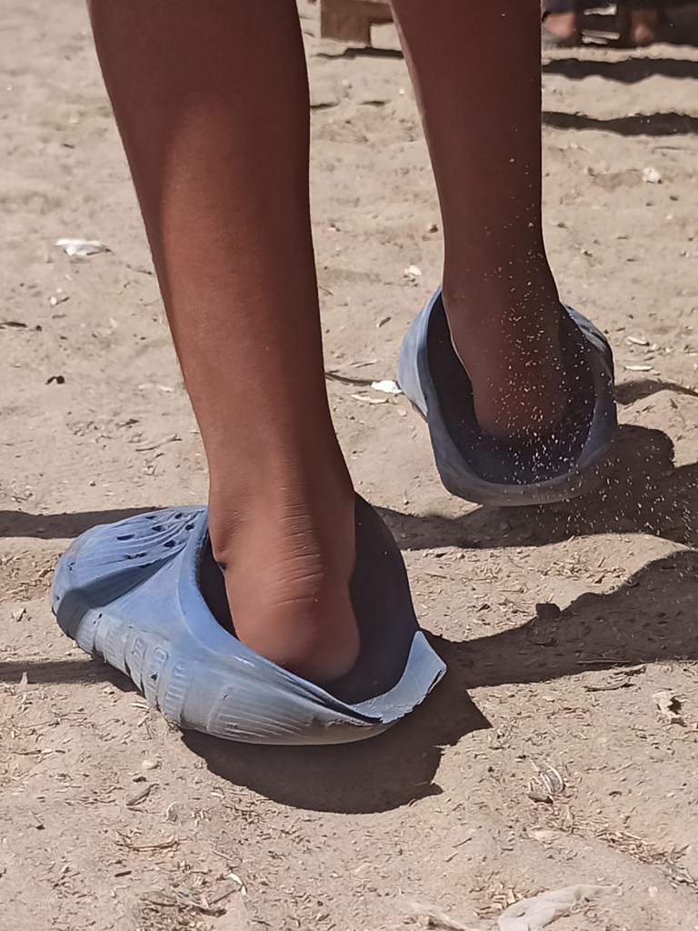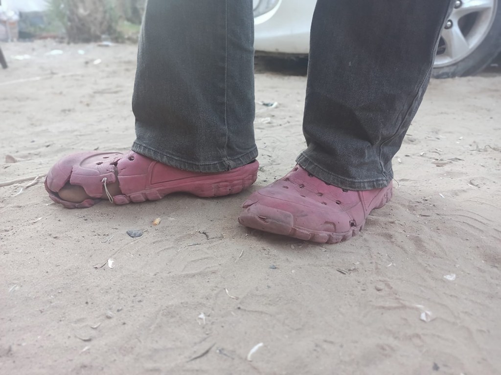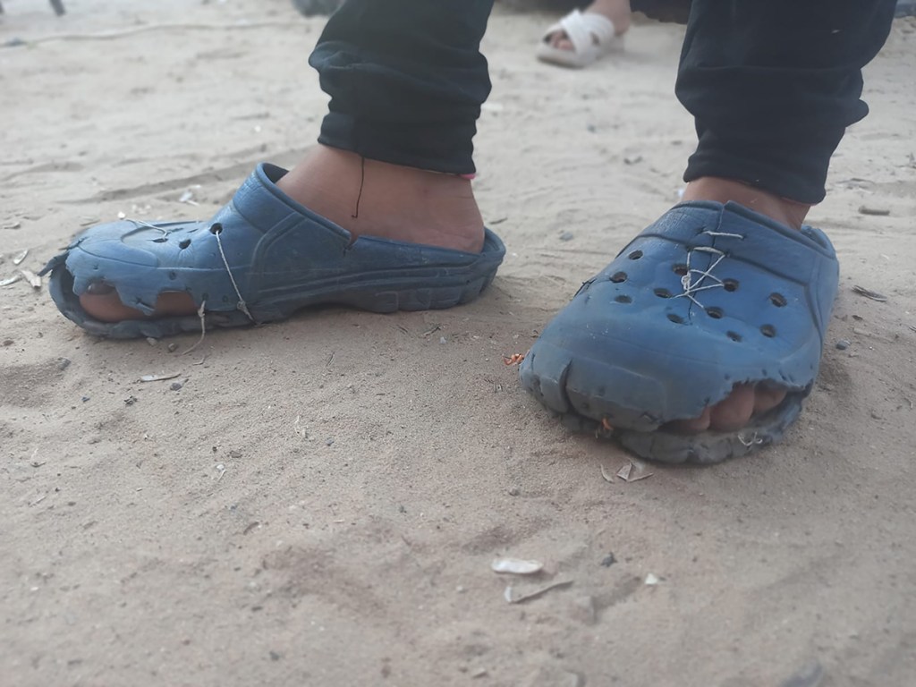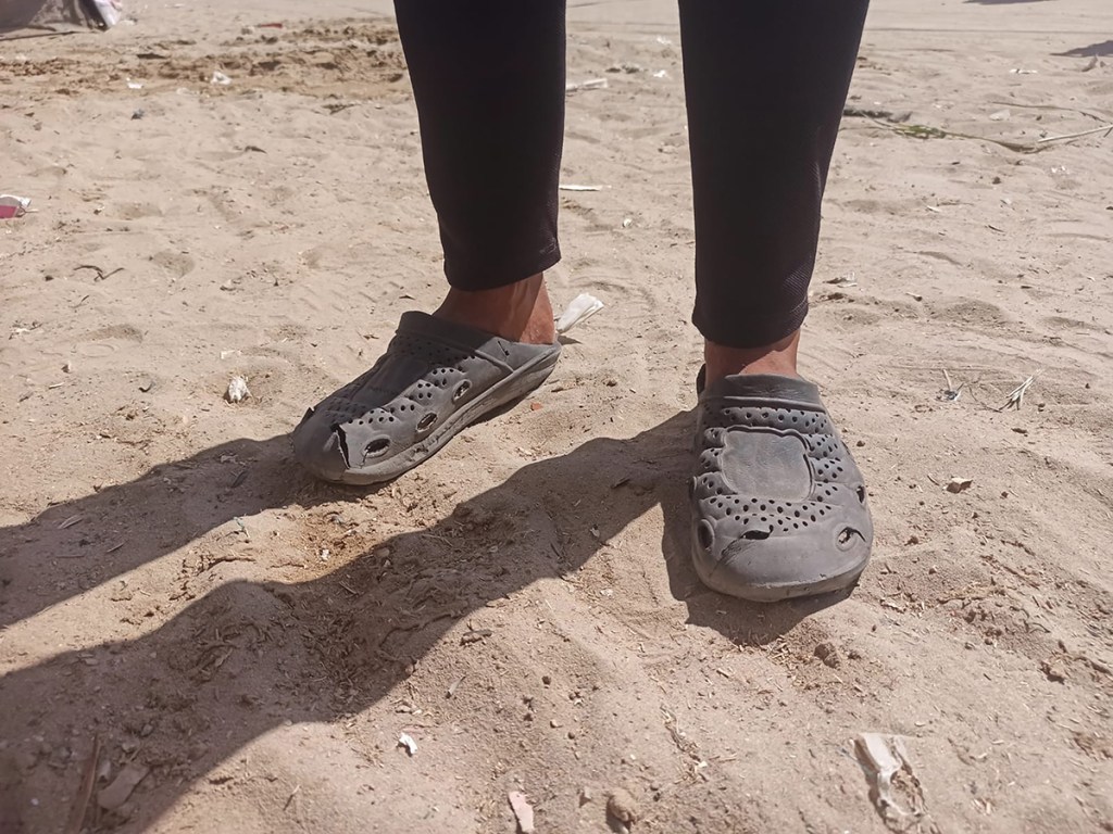 Due to the current siege, shoes have taken on new significance in Gaza: months of forced displacement left many people with worn, broken shoes or no footwear at all. This reality is rarely covered by the news media. Over time, many people have come to rely on plastic shoes distributed by UNRWA. Brightly coloured and cheaply made, the shoes wear out quickly due to the demands of living through the genocide and constant displacements. These shoes are now commonly known in Gaza as al Dorgham (lion), which can also mean sturdy, strong, and resilient.