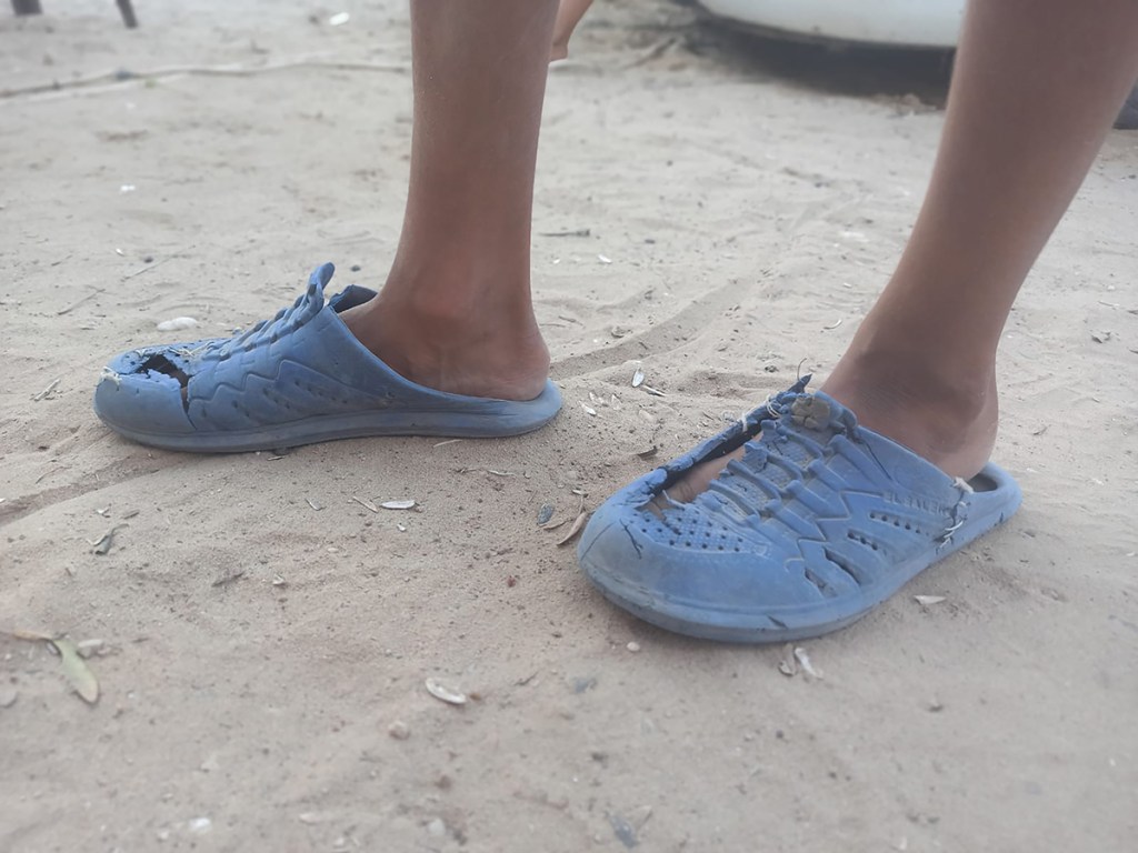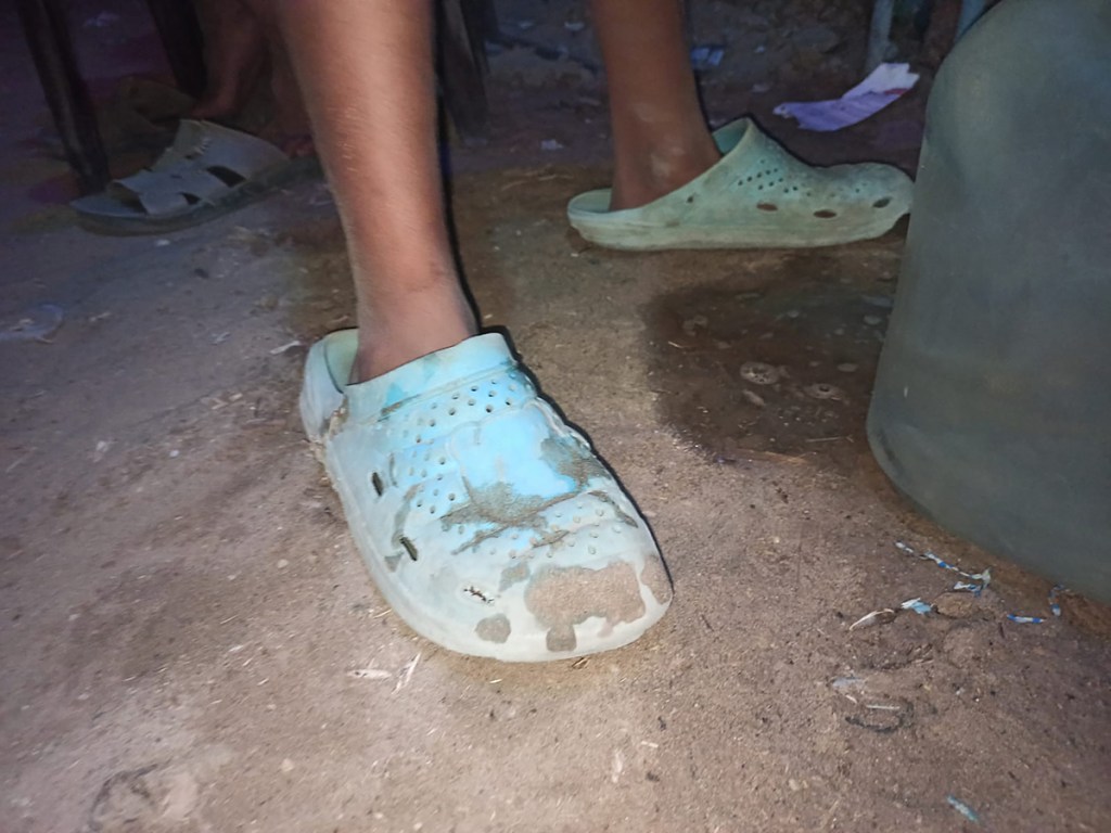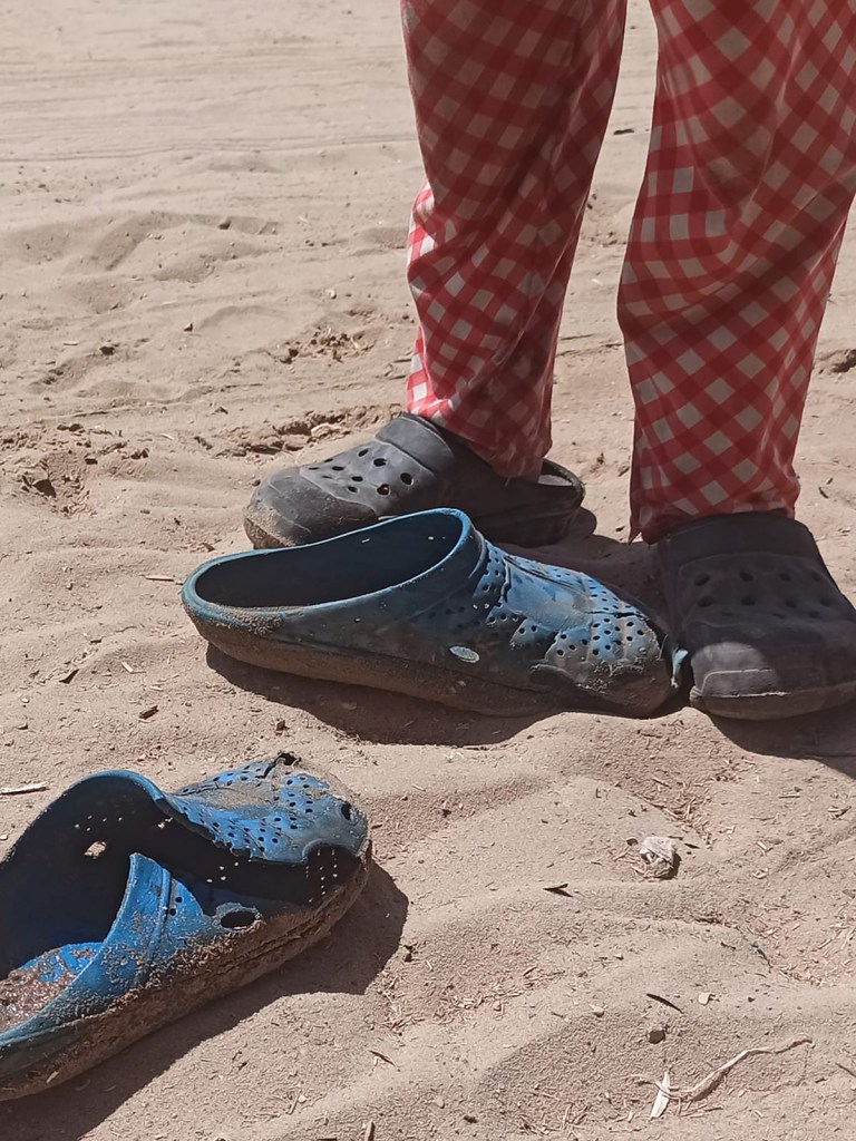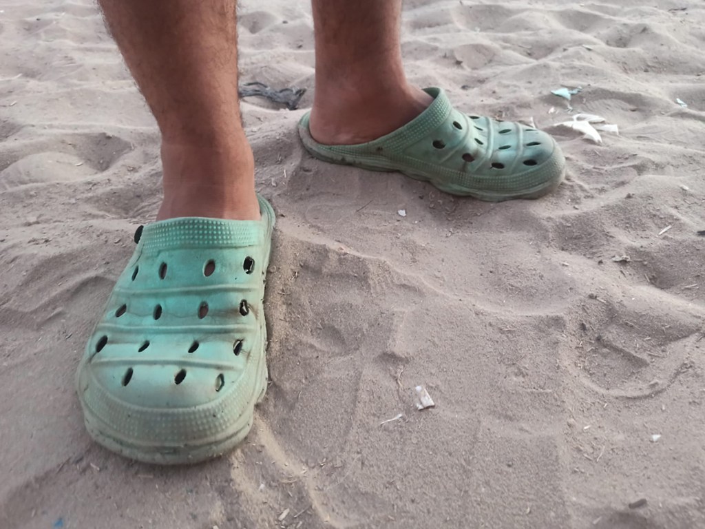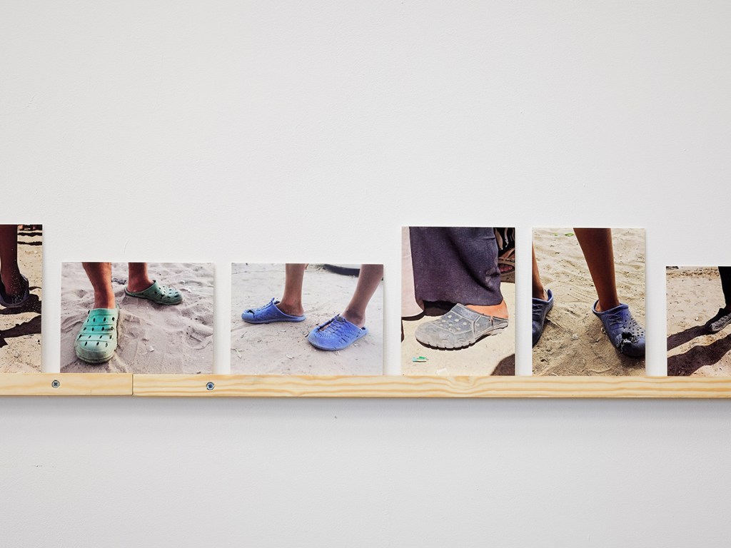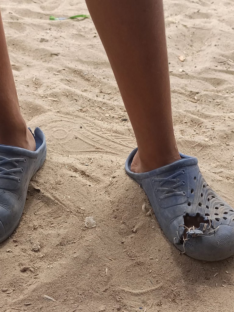 Due to the current siege, shoes have taken on new significance in Gaza: months of forced displacement left many people with worn, broken shoes or no footwear at all. This reality is rarely covered by the news media. Over time, many people have come to rely on plastic shoes distributed by UNRWA. Brightly coloured and cheaply made, the shoes wear out quickly due to the demands of living through the genocide and constant displacements. These shoes are now commonly known in Gaza as al Dorgham (lion), which can also mean sturdy, strong, and resilient.